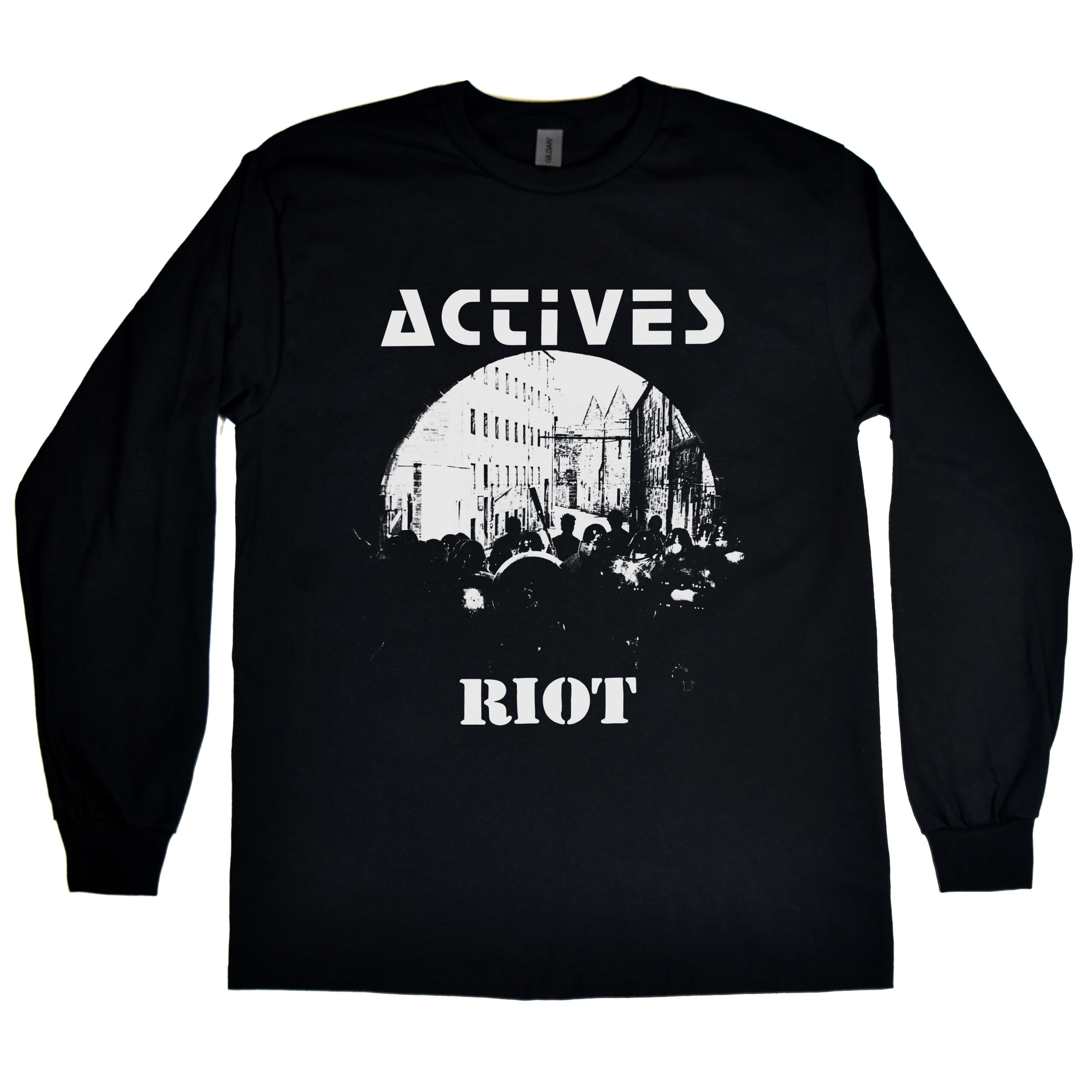 Actives “Riot” men’s 100% cotton long sleeve shirt. Classic fit and slightly slim. Water-based ink.