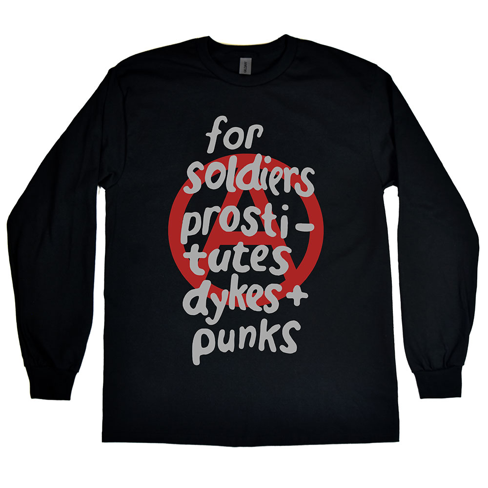 Seditionaries “For Soldiers, Prostitutes, Dykes & Punks” men’s 100% cotton long sleeve shirt. Classic fit and slightly slim. Water-based ink.