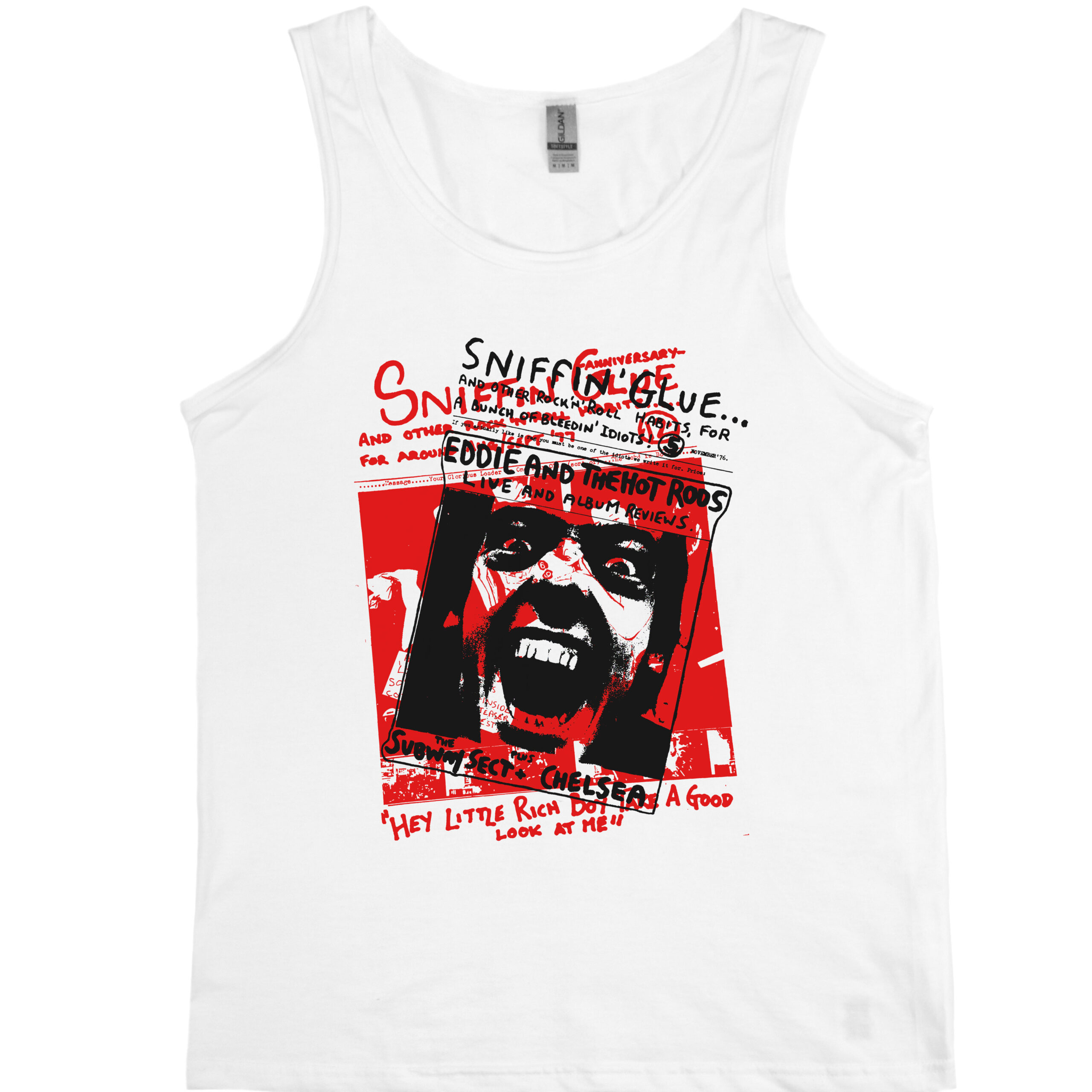 Sniffin’ Glue “Eddie and the Hot Rods” men’s 100% cotton tank top. Classic fit and slightly slim. Water-based ink.