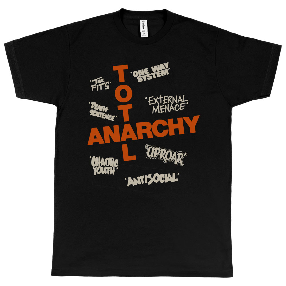 Total Anarchy men’s t-shirt with a “Compilation” graphic featuring External Menace, One Way System, Anti Social, The Fits, Chaotic Youth and. Uproar.